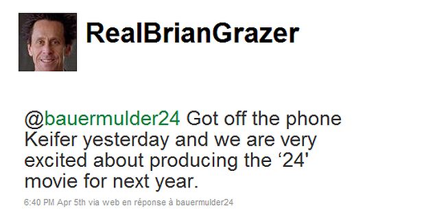 24 heures chrono est enfin confirmé par son producteur Brian Grazer pour une sortie cinéma en 2012. Celui ci a sauté littéralement sur son compte Twitter pour annoncer au monde la bonne nouvelle, confirmer qu’il en était bien le producteur et que Kiefer Sutherland est bien à bord.