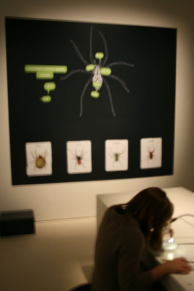 Qu’est-ce qu’une araignée ? Un animal avec 8 pattes (contrairement aux insectes...), un corps divisé en deux parties : le céphalothorax et l’abdomen (contrairement aux acariens...), des yeux (de 0 à 8), des chélicères (appendices qui injectent le venin), des filières (pourles fils de soie). Pour mettre au clair la famille des araignées (les aranéides), l’exposition présente les animaux « parents », ce qu’ils ont en commun et leurs différences - faucheux, acariens, scorpions - et les faux amis qui n’ont d’araignée que le nom comme l’araignée d’eau (c’est une punaise), l’araignée de mer (un crustacé) et l’araignée chez le boucher qui est un morceau de choix de viande de boeuf.