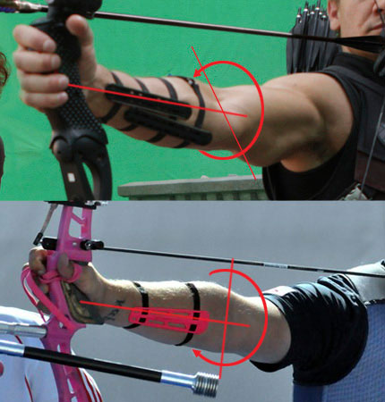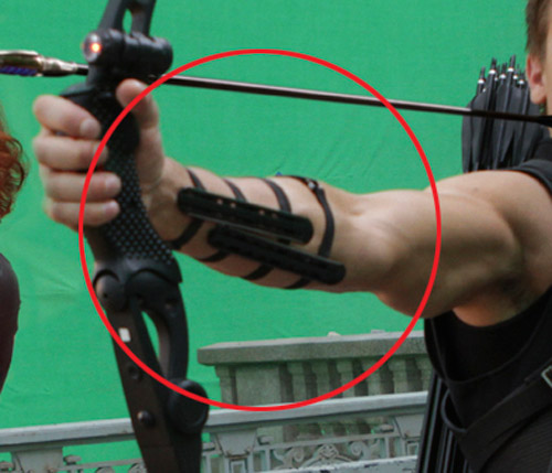 « Remarquez comment son coude est orienté à 45° alors que celui de Bradley Ellison (expert du tir à l’arc) est vertical. Hawkeye a donc un joli muscle en plein dans le passage de la corde, d’où le second brassard ».