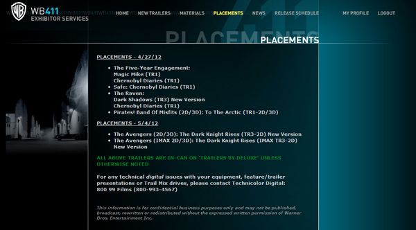 C’est grâce au site Nolan Fans que l’on peut découvrir cet écran issu d’un site de la Warner Bros. réservé aux exploitants de salle qui confirme que la nouvelle bande annonce de The Dark Knight Rises sera diffusée lors des séances de The Avengers, le 4 mai aux USA.