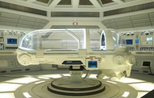 « Alors elle tombait dans un état de prise et de perte de conscience périodiques durant quelques heures pendant que la machine la réparait. Alors qu’elle reprenait conscience, elle observait la chose grandir dans la cabine à l’extérieur, et même tuer des gens. Et donc comme elle émergeait du pod huit heures plus tard, la chose était à bord du vaisseau, et assez gros pour être un énorme danger. Voilà comment la scène du MedPod était originellement conçue. Et pour sa capacité à se remettre si vite de la chirurgie... Ben c’était plus laborieux dans ma propre version [...] »