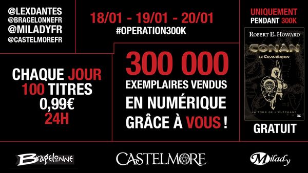 Pour remercier ses lecteurs de leur fidélité, Bragelonne lance cette semaine une ultime opération ! Du vendredi 18 au dimanche 20 janvier, Bragelonne propose 300 titres de son catalogue numérique à raison de 100 titres par jour au prix exceptionnel de 0.99 €.