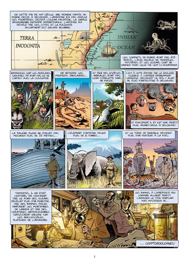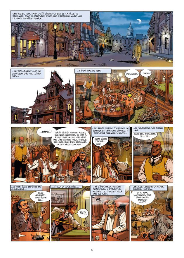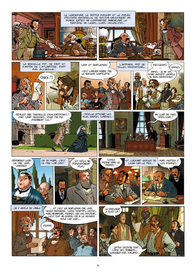 L’action de cette bande dessinée se déroule donc en fin de 19ème siècle, à l’époque des grandes découvertes et il est impossible en lisant cette histoire d’aventure de ne pas penser à Arthur Conan Doyle ou encore à Jules Verne qui sont tous deux des sources d’inspiration évidentes de cette folle histoire et des folles machines qui la composent. Le début propose une mise en place de l’histoire qui va très vite trouver un rythme soutenu et enfin l’action et l’exploration prendront le pas sur les discussions. L’aventure, l’humour et les retournements de situations ponctuent le récit qui nous transporte dans bien des coins du globe avant d’arriver à la destination finale.