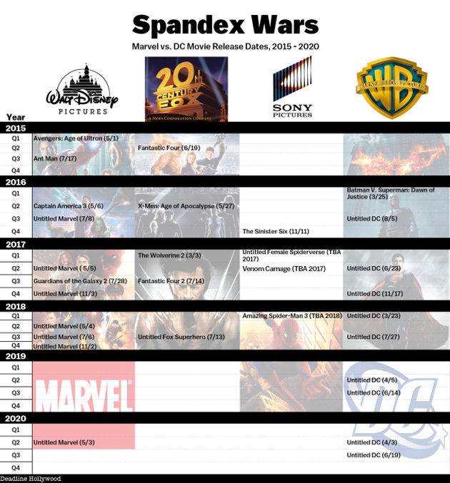 Signe des ambitions du propriétaire de DC Comics, Warner a également réservé des dates de sorties jusqu’en 2020 pour des projets qui n’ont pas encore de titre. Deadline en a profité pour faire le point sur l’ensemble des sorties cinéma de films de super héros en incluant la franchise Spider-Man de Sony et l’univers Mutant de la Fox. Et là, il faut bien avouer que certaines années, il y aura indigestion. De 3 à 4 films par an actuellement, nous allons passer à 6 en 2016, 9 en 2017 et 7 en 2018. Est ce que le public va répondre présent à tous ces films ? Pas sûr...