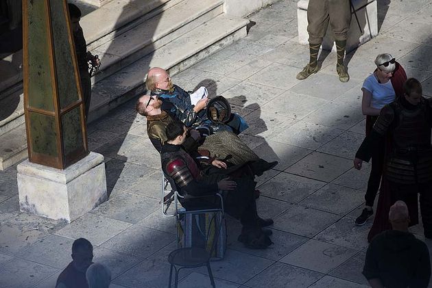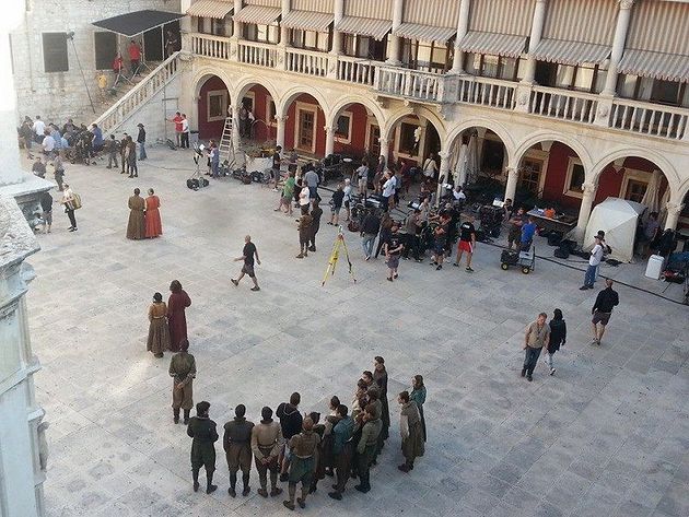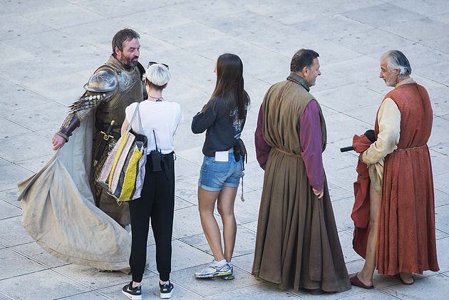 Le tournage de la saison 5 de Game of Thrones se déroule maintenant dans la ville de Šibenik, en Croatie. Sur ces photos, on peut voir Maisie Williams (Arya Stark), Mark Gatis, Roger Ashton-Griffiths (Mace Tyrell) et Ian Beattie (Meryn Trant) en costumes.