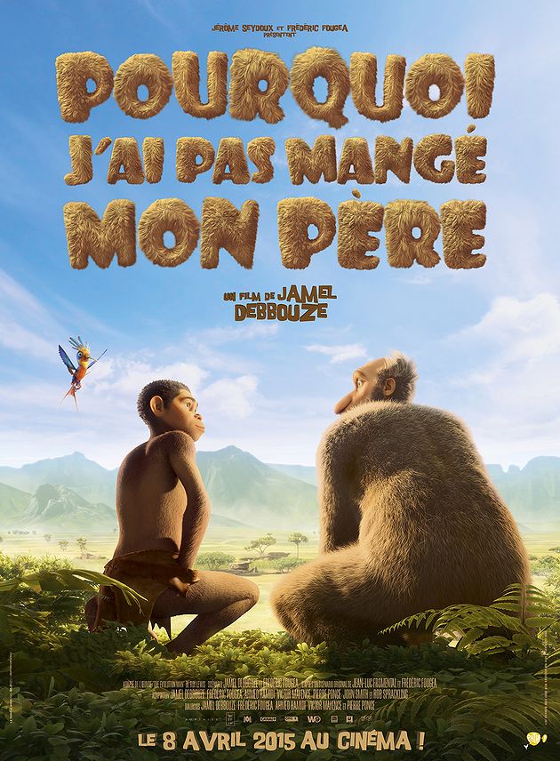 Pourquoi j’ai pas mangé mon père de Jamel Debbouze (Sortie le 8/04/2015) : L’histoire trépidante d’Edouard, fils aîné du roi des simiens (les pré-humains), qui, considéré à sa naissance comme trop malingre, est rejeté par sa tribu. Il grandit loin d’eux, auprès de son ami Ian, et, incroyablement ingénieux, il découvre le feu, la chasse, l’habitat moderne, l’amour et même… l’espoir. Généreux il veut tout partager, révolutionne l’ordre établi, et mène son peuple avec éclat et humour vers la véritable humanité… celle où on ne mange pas son père.