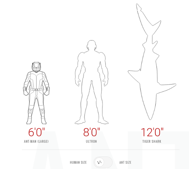 Avec le très attendu Ant-Man qui débarque sur nos écrans dans un peu plus d’un mois (le 14 juillet 2015), Marvel et Disney mettent la gomme sur la promotion. Faisant suite aux nouvelles images et à la promo télé étendue, le site officiel du film de Peyton Reed a été mis à jour. En plus d’une vue de face et de dos de l’intégralité du costume de l’homme fourmis, on a aussi droit à des graphiques qui nous montrent exactement comme le héros est petit quand il est petit, et comment il n’est pas forcément très grand quand il a sa taille "normale."