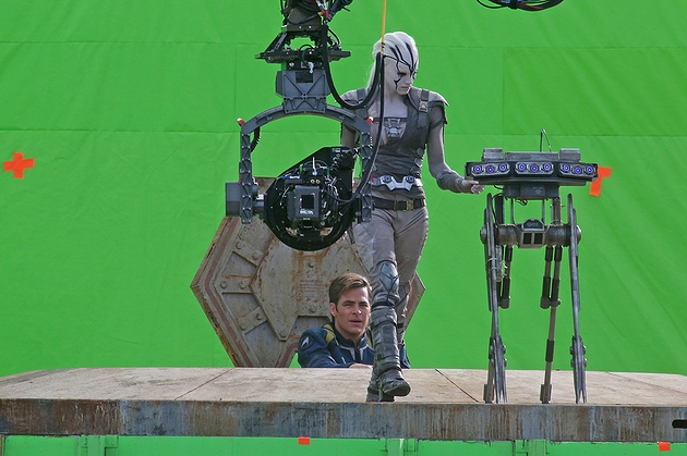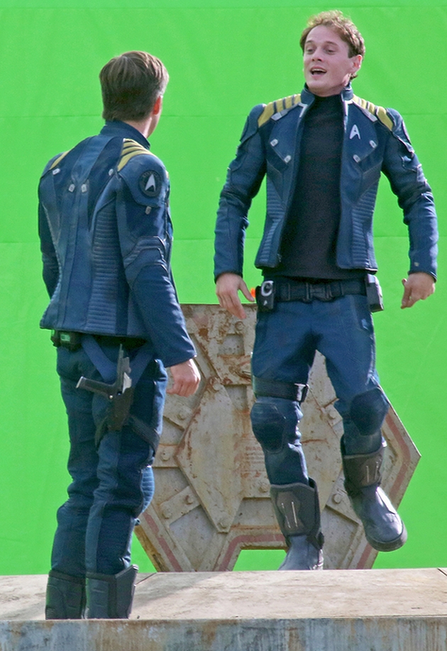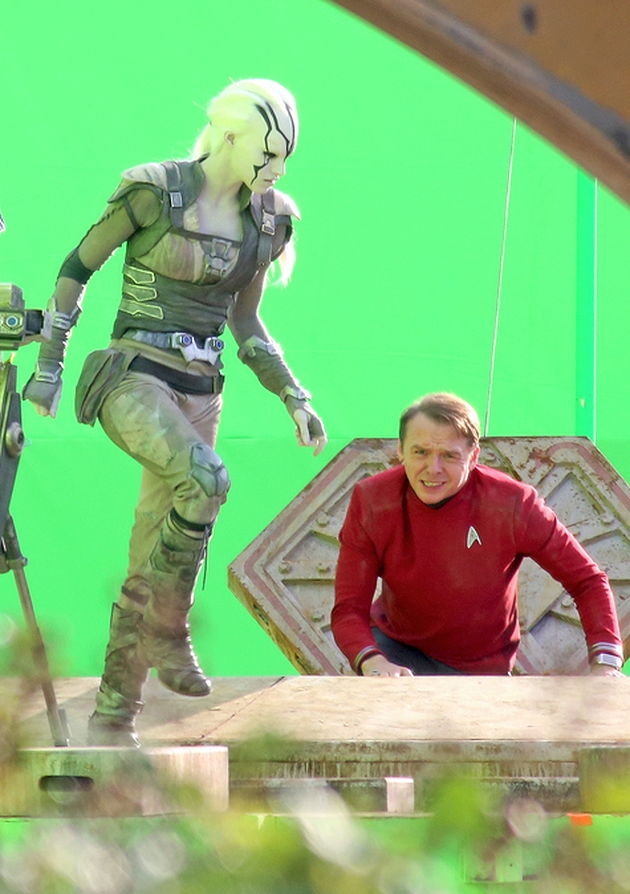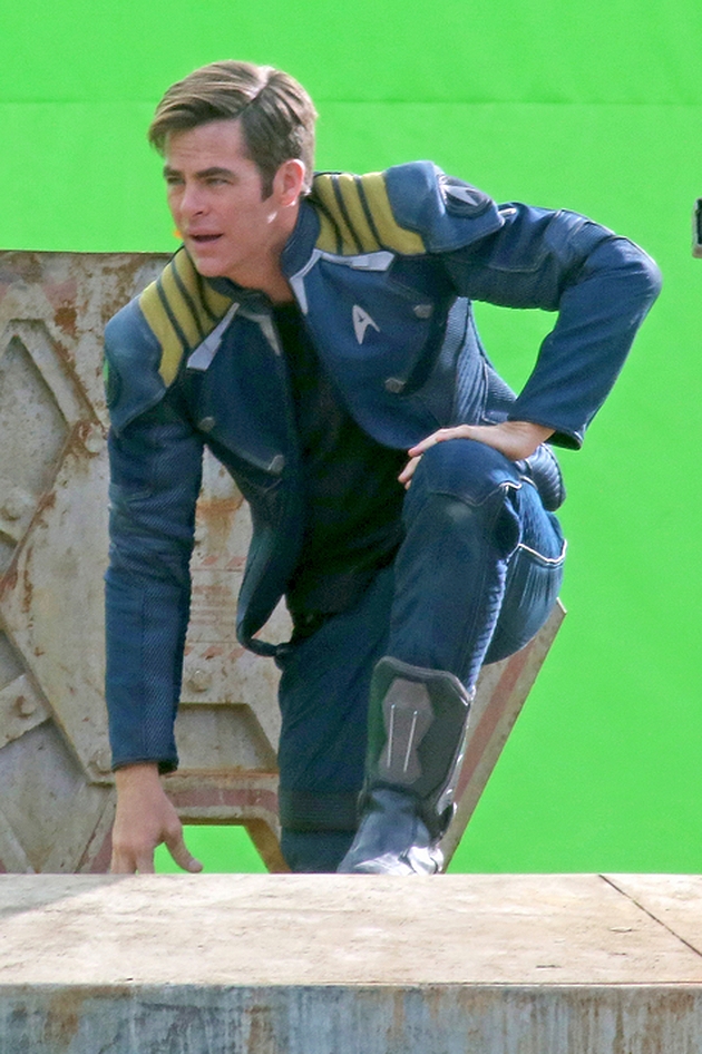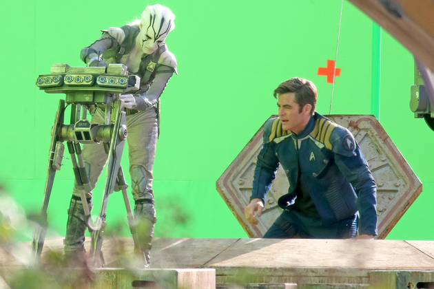 Chris Pine, Simon Pegg (qui a co-écrit le scénario avec Doug Jung), Anton Yelchin et Sofia Boutella (la fameuse Gazelle de Kingsman) répètent et tournent depuis déjà 3 heures cette scène importante du film, dans laquelle Kirk et le personnage de Boutella émergent du sas d’un vaisseau endommagé. Cette dernière utilise une sorte de console avant que Scotty et Chekov ne puisse prudemment quitter le vaisseau sains et saufs.