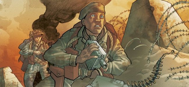 4ème tome de Opération Overlord, qui nous présente à chaque fois des personnages ou des situations différentes. Ici dans Commando Kieffer il est question d’un reporter de l’armée anglaise qui mettra sa vie en danger pour rapporter des images, documenter, témoigner, garder une trace pour le souvenir. La moitié de la BD concerne les préparatifs et le voyage avant le débarquement et c’est une ambiance très pesante qui est représentée, la peur, l’appréhension, l’inconnu. Il s’agit là du point de vue de ce journaliste contrairement aux autres numéros qui montraient les soldats en première ligne. Mais ici les soldats sont aussi à l’honneur, mais filmés et suivis par Clague qui devient notre guide. C’est à travers l’objectif de sa caméra qu’il leur rend hommage parce que c’est avant tout une histoire fraternelle, d’amitié entre ces soldats.