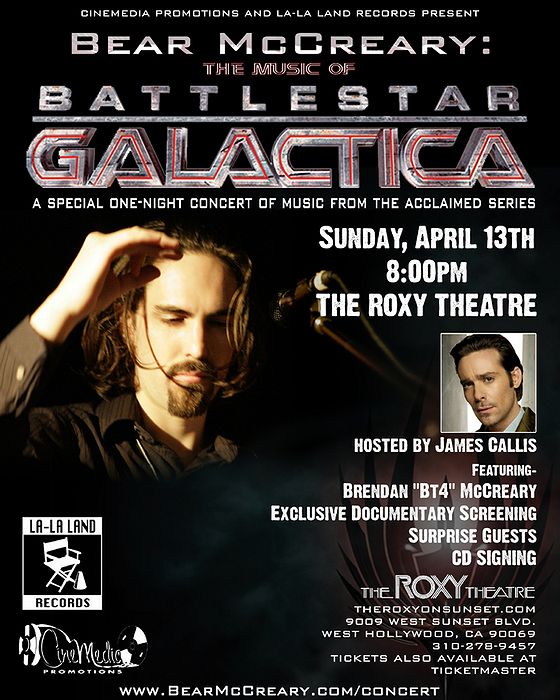 Alors que la 4ème et dernière saison de Battlestar Galactica débute sur SCIFI en avril, Bear McCreary, le compositeur attitré prépare un concert pour le 13 avril qui comprendra un panachage de musiques des 3 premières saisons de la série.