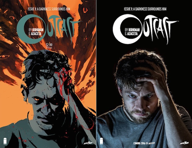 "Si The Walking Dead est le film de zombies qui ne finit jamais - au sujet de ces personnes qui survivent depuis des années et des années d’une manière que vous n’avez jamais vu dans un film de zombies avant - Outcast parle de personnes qui traitent la possession démoniaque comme un problème résoluble. Donc au lieu d’effectuer un exorcisme puis partir en balançant des trucs comme : "Appelez-moi quand le prochain arrive.", ces personnages vont être engagés dans ce qui se passe réellement, comment le prévenir et comment l’arrêter une fois pour toute… Je dirais que la série est certainement une expansion de ce qui se passe dans la bande dessinée. La bande dessinée se concentre presque exclusivement sur Kyle Barnes et le révérend Anderson et quelques personnages secondaires ici et là. Mais surtout, il met l’accent sur ces deux personnages. Dans la série, ce que nous faisons est étendre un peu ce monde, donner beaucoup plus à faire aux personnages, et définir plus précisément la ville de Rome, en Virginie occidentale. On a pris ce qui est dans la bande dessinée et nous avons ajouté des choses vraiment cool et intéressantes. Ce n’est pas comme The Walking Dead, où nous faisons des choses complètement différentes. Il y a quelques grandes différences avec ce que nous faisons avec Kyle et Anderson, mais en grand partie, nous avons étendu et renforcé ce qui existe dans le comics".