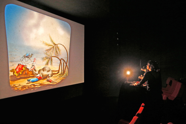 Anne Gourdet-Marès : Les représentations ont commencé le 30 septembre 2015. Il a fallu écrire un conte à partir des plaques que je possédais (utilisées pour diffuser les images à l’écran). Les plaques sont le fil conducteur du récit. Je voulais créer une mise en abyme, raconter avec des plaques originales l’invention de la lanterne magique. L’histoire rappelle donc celle de cet astronome hollandais, Christiaan Huygens, qui a découvert les anneaux de Saturne et qui, par ses connaissances en science optique, a su trouver la bonne combinaison de lentilles pour réussir à projeter une image. Je voulais aussi évoquer la fête foraine qui s’est appropriée en premier le cinéma. Nous avons ensuite sélectionné des films en lien avec la magie de la lanterne. Il est intéressant de voir comment les premiers cinéastes étaient porteurs de l’héritage de la lanterne magique. Pour mettre en lumière l’accompagnement musical, indissociable du spectacle cinématographique à ses débuts, une leçon de musique sous forme d’improvisation musicale interactive termine le spectacle. Nous voulions montrer comment nos émotions, notre ressentie des images, sont manipulées par la musique. Pour clore ce voyage dans le temps, une visite de la galerie des appareils est proposée pour ouvrir le regard du public sur l’aspect technique du cinéma.