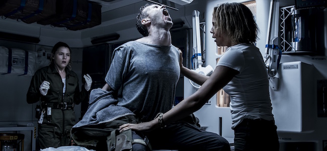 On assiste donc à l’atterrissage sur une nouvelle planète de l’équipage du Covenant. Rien n’est révélé quant aux motivations de l’équipage, même si la bande-annonce et surtout l’une des photos promotionnelles diffusée récemment permettent de deviner leur mission. Lorsque le vaisseau traverse l’atmosphère et atteint les nuages, les images sont somptueuses. Nous sommes immédiatement plongés dans l’ambiance propre à Alien. Suite à une ellipse, nous sommes brutalement catapultés face une situation sanitaire urgente. L’un des membres de l’équipage a été contaminé et nous seuls spectateurs savons qu’il y a de grandes chances que l’histoire propre à la saga se répète. Chacun va être confronté à des choix moraux pour se protéger et protéger le reste du groupe. Il paraît clair que peu d’entre eux survivront. Nous ne pouvons pas encore nous attacher à ces nouveaux personnages, mais le jeu des acteurs est tellement crédible que nous sentons déjà pointer en nous une réelle empathie.