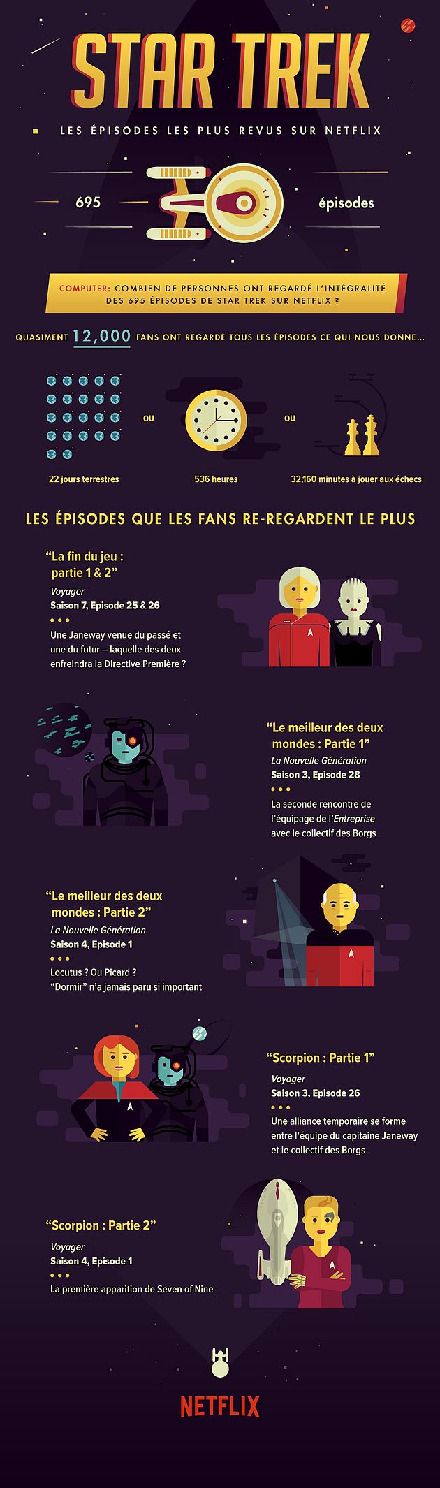 La collection complète de Star Trek se compose de 695 épisodes, tous désormais disponibles sur Netflix. Il ne faut pas moins de 536 heures (ou 23 jours) pour en regarder l’intégralité. Mais quand on est fan on ne compte pas…. 12000 hardcore trekkies ont ainsi savouré cette épopée intergalactique sur Netflix.