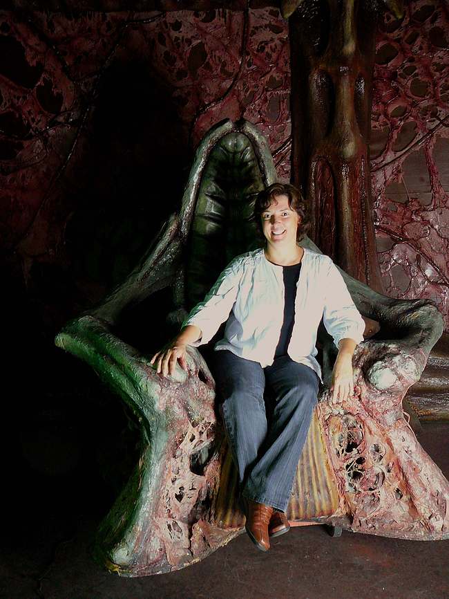 Bev me propose d’aller visiter un vaisseau Wraith de l’autre cote du plateau. Nous nous asseyons dans le fauteuil de la reine et nous nous prenons en photo. De vraies gamines ! Quelques membres inactifs de l’équipe de tournage sont en train de se triturer les méninges pour inscrire un mot d’adieu à l’attention de Joe Flanigan sur une boite en contreplaqué. Ils ont de drôles de coutumes dans le coin...
