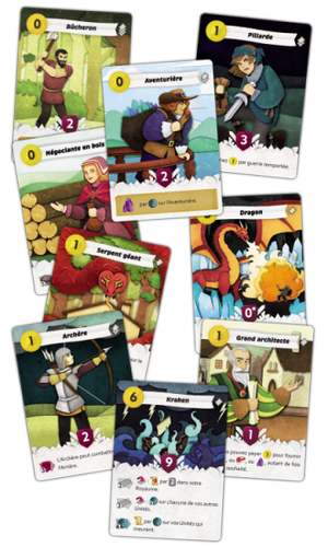 Dans une belle boîte blanche, le jeu se compose de 81 cartes Unité, 25 cartes Bâtiment, 5 cartes aide de jeu, 1 piste de score, 5 marqueurs de score, 1 pion Temps, 40 jetons Or, 30 jetons Âge. Les illustrations des cartes sont parfaites pour le thème mais la piste de score (très vide) et les jetons ne sont pas à la hauteur, cependant le principal n’est pas là.