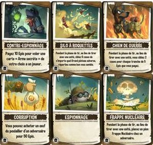 – les joueurs révèlent si les tirs ont touché une ou plusieurs de leurs unités (à la façon de la bataille navale). Chacun gagne des Épis en conséquence. Avec 25 Épis on peut acheter un œuf adverse, le gagnant est celui qui aura réuni 5 œufs adverses ou celui qui est le seul à posséder une unité en vie.