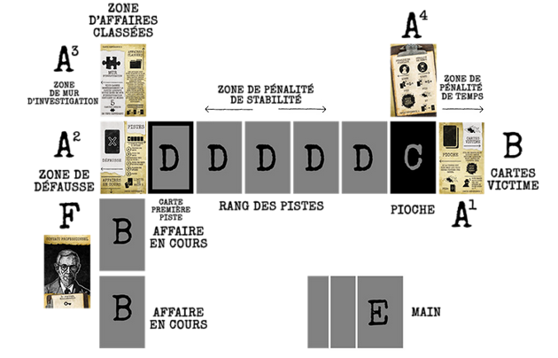 Le joueur installe sa ligne de cartes, constituée de 5 indices, 2 lignes d’affaire en cours (des victimes) en dessous, et quelques cartes de référence autour et commence avec 3 cartes indices en main.