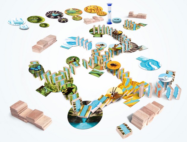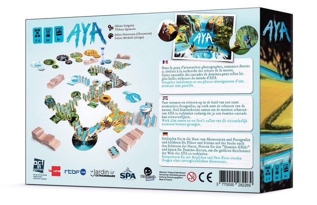 Dans AYA, vous coopérez pour relier un maximum de tuiles Paysage et de jetons Photo Animal au moyen d’une chaîne de dominos placés verticalement les uns à la suite des autres.