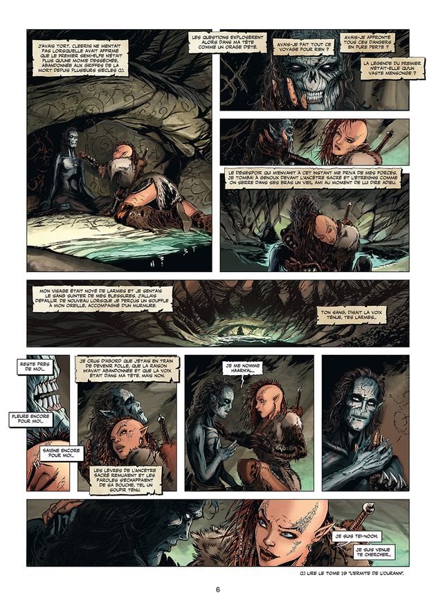 C’est une histoire très dure que nous raconte ce 24ème tome de la série des Elfes, celle d’un peuple sur le point de s’éteindre. Le récit se compose d’une succession d’histoires racontées en flashback, à commencer par celle de Tei-Nooh, son enfance volée à coup de poing, à force de combats, c’est le parcours initiatique d’une enfant battues transformée en tueuse, suivie de l’histoire d’esclavage de Faarl’han puis de l’histoire d’Orunth’al, le frère de Tei-Nooh, récemment libéré des orcs et enfin celle de Haarn’al qui renait au fur et à mesure du récit comme l’espoir des semi-Elfes.