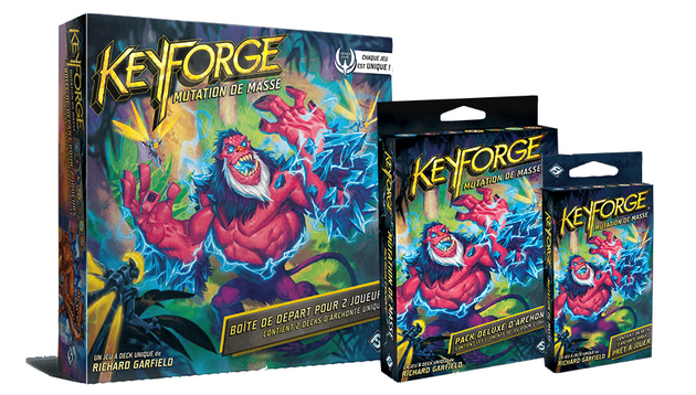 Proposé en deck unique simple (pour ceux qui connaissent le jeu), en pack Deluxe, pour ceux qui le découvre (avec les pions) ou en deck 2 joueurs (2 decks, 2 sets de jetons, 2 tapis), Mutation de Masse s’adapte à toutes les situations.