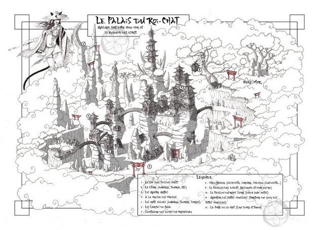 les voyages, sous l’égide de l’empereur immortel, mi-homme, mi-dragon), les codes de conduite (le Reigi ou Valeur, les différentes Voies), les forces armées, les factions notables (13 clans principaux, 3 clans tribaux, et 9 autres influences), Sakura-kyô (les quartiers, personnages principaux de la Cité de l’Empereur) à travers une cartographie complète des lieux importants, Mononoke (les esprits et autres Yôkai : les kitsune, les bakeneko, les tengu, les tanuki...) et d’autres cités (Hotarushi, Yugure, le Palais du Roi-Chat, le cimetière des Dieux...) et les inspirations des films de Rônin (Après la Pluie), des films de malédiction (Dark Water), des anime ou manga (Inu-Yasha, Le Voyage de Chihiro, Mon Voisin Totoro, Princesse Mononoke...), des jdr (Kuro, L5R, Tenga...), des romans (La Voie du Sabre, Les Contes du Magatama...)