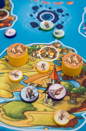 – La phase de pichenette : on place un jeton dans son coin, et on le précipite avec une pichenette en direction d’une des 4 zones, s’il touche une zone, il y reste, s’il touche une cité dans cette zone, il peut échanger son petit pion contre un temple. Tout ce qui se trouve en dehors (dans l’eau) est défaussé. On continue jusqu’à ce que chaque joueur ait joué tous ces prophètes.
