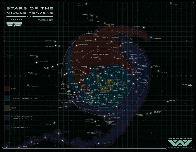 Encartée, on trouve aussi une carte A2 de l’espace connu, nommée "Étoiles des cieux médians", occupée essentiellement par : Les systèmes du noyau, entourés du Voile Extérieur, eux même entourés des Territoires de la Bordure Extérieur.