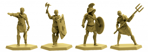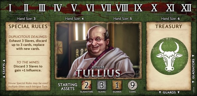 – Commerce : échanger des cartes librement et en mettre en vente aux enchères d’autres. Enfin, on met aux enchères le titre d’Hôte, qui fera gagner de l’influence et organisera les combats de gladiateurs (sur le plateau central, les héros de chacun sont représentés par la figurine, équipés d’armes et de capacités et s’affrontent à coup de dés d’attaque et de défense, tout en évitant les intrigues imposées par tous).