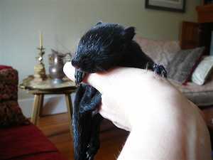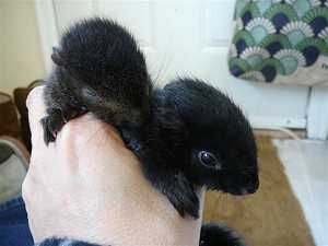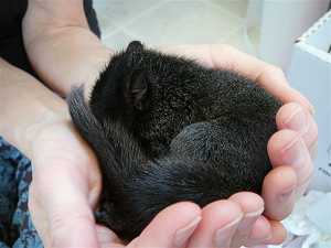 Mardi dernier, alors que je rentrais chez moi, j’aperçois au pied du marronnier devant la maison, une petite forme noire apparemment mobile. Ca ne peut pas être une crotte, car les crottes, ça ne bouge pas. Je m’approche et découvre un bébé écureuil noir, manifestement tombé de son nid. Je le ramasse, il bouge à peine. Il me regarde de ses grands yeux effarés et pousse un hurlement strident, comme une craie sur un tableau noir. Que faire ? Je vais voir ma voisine qui me dit qu’elle ne sait pas plus que moi que faire pour sauver cet animal, et qu’elle a trouvé sa mère morte dans le caniveau la veille. Pas la peine de chercher le nid, il n’y aura personne pour le nourrir. Je le ramène à la maison, lui prépare un petit nid dans un panier, trouve un compte goutte et le nourris de crème coupée avec de l’eau. Il se gave ! La pauvre petite chose n’a pas mangé depuis que sa mère est morte, 24h auparavant probablement.