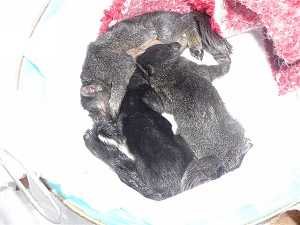 Je me doutais bien qu’une portée d’écureuils ne comportait pas qu’un seul individu, et le vendredi c’est sans surprise que je trouve un second écureuil dans le caniveau sous le fameux marronnier. Celui-ci est un peu plus gris et grouille de vermine alors que Jack était très propre. Je le ramène à la maison, et avant de le mettre dans le panier, tente de lui ôter, une par une, les horribles petites pestes oranges qui le parasitent. Puis je le nourris avec le biberon de Jack, ou plutôt, je lui injecte de force un peut de lait au fond du gosier car l’animal semble ne plus avoir aucune force. Passera t-il la nuit ? Il n’a pas mangé depuis 4 jours… Mes écureuils s’endorment, et je retourne dans le salon pour regarder un peu la télé.