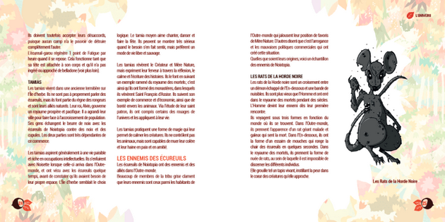 – L’univers (18 pages), présente Noisette, la première écureuille et Miauleuse, la première chatte à travers la genèse de l’histoire, puis la situation aujourd’hui avec les 7 maisons de Noisette, les religions de Noixtopia, les tribus et les ennemis des écureuils.