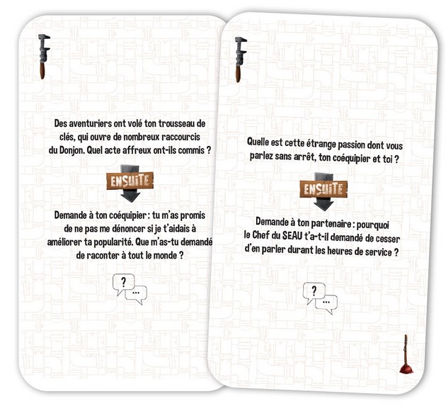Ainsi, une histoire d’entretiens de canalisations d’un donjon, donc souvent complètement loufoque, se racontera au fur et à mesure des réponses des joueurs. Le plus efficace (celui qui aura apporter le plus à l’histoire), sera désigné en fin de partie et l’emportera.
