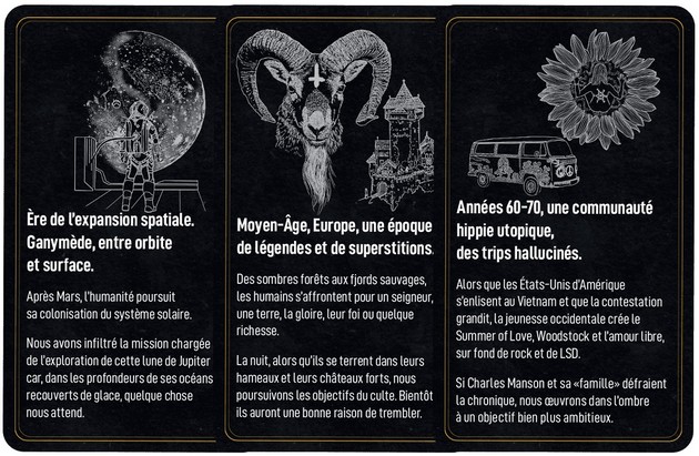 Après avoir lu les règles qui tiennent sur quelques cartes, on choisit un contexte (le vaudou en Louisiane, l’Antiquité, Paris 1920, années 60-70, l’expansion spatiale, les grandes découvertes, cyberpunk, l’Europe du Moyen-âge), et l’objectif du culte (réveiller une entité cosmique, obtenir la vie éternelle, extinction de l’humanité, faire éclore un œuf, rappeler, le banni, asservir une créature surnaturelle, ouvrir la voie à d’implacables légions, ouvrir un portail vers les Contrées du Rêve).