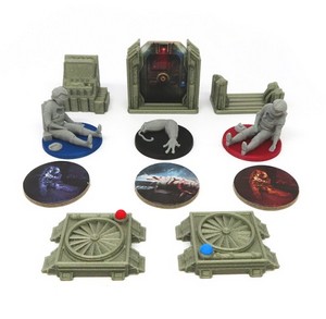Le kit pour Némésis va encore plus loin. En effet, il ne se contente pas de remplacer juste les décors et jetons (porte, ventilation, consoles de contrôle, cadavres...) mais propose aussi des bases de figurines qui permettent de transporter en même temps les cubes d’état (un défaut du matériel du jeu original).