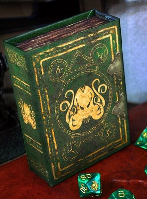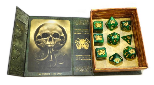 Les sets de dés Elder Dice sont de très belles boîtes au clapet magnétique contenant 9 dés : 1d4, 3d6, 1d8, 1d10, 1d%, 1d12 et 1d20, pour être utiles aux systèmes les plus pratiqués des Jdr inspirés par le Mythe de Cthulhu. La tête du vénéré Grand Ancien occupe d’ailleurs la face 1 de tous ces dés.