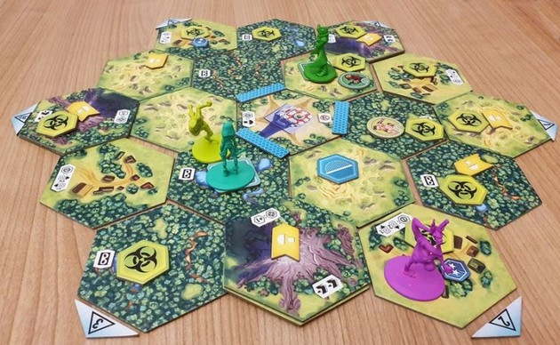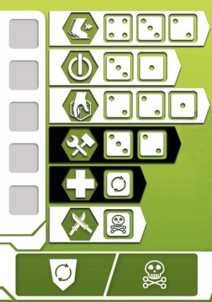 – Phase d’Actions : Le joueur actif effectue des actions en assignant des dés aux cases Action de sa fiche Personnage et de ses cartes Équipement, ainsi qu’en effectuant des actions gratuites (courir, activer un lieu, trouver une balise ou une caisse, construire un piège, un abri, des murs, soigner, combattre)