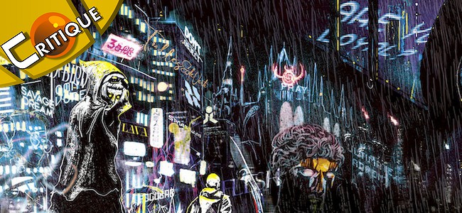 – Une description de la mégapole Cy après l’Incident : de ses taudis pourris où gangs, cultes et corporations militaires se font la guerre, aux forêts de grattoirs aveuglantes, aux cathédrales de néon et aux arcologies holo-scintillantes de Central, en passant par les zones industrielles toxiques de l’enfer qui enveloppent le tout d’un smog de mort toxique (mais certifié CYstainable Planet).