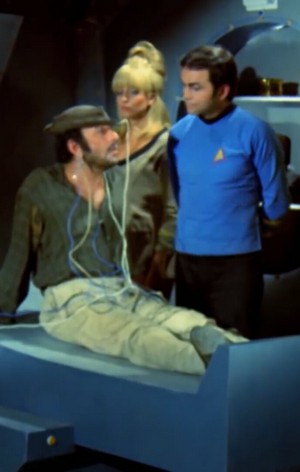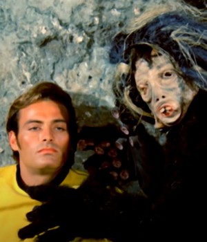 L’équipage découvre, comme il se doit, une planète mystérieuse, sur laquelle il est décidé de se faire téléporter. En manque visible de moyen techniques, l’effet est alors rendu par de la peinture blanche, visiblement appliquée à même la pellicule (il en sera de même plus tard pour les rayons de phasers). Quelle inventivité !