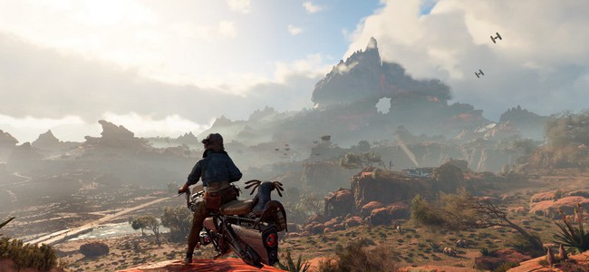 Il n’y a pas d’utilisation de la force, bien sûr, mais du gunfight, de l’infiltration, des course-poursuite sur motojet, mais aussi du dogfight en vaisseaux. L’héroïne est accompagnée de son petit compagnon qui l’aide dans toutes ces étapes du gameplay, pour distraire les ennemis et plein de petites fonctions contextuelles.