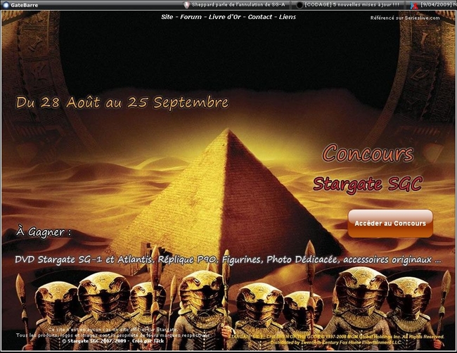 http://www.stargate-sgc.net/ organise un concours pour fêter la ressortie du pilote de Stargate SG1 en version longue. Pour accéder au concours et ses nombreux lots, cliquez sur l’image sous la bande annonce :