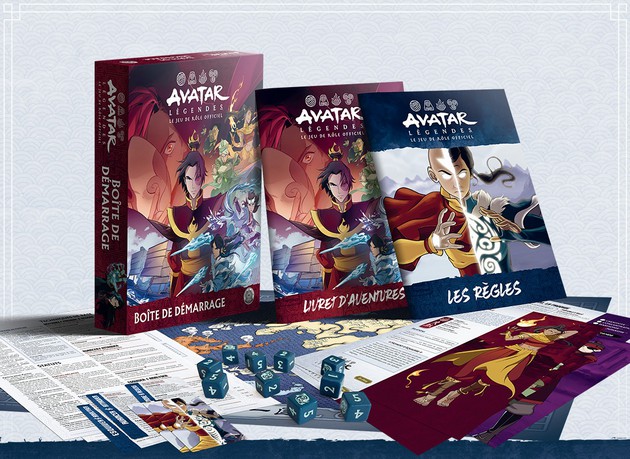 – La Boîte de démarrage (Un livret de 32 pages présentant un condensé des règles, un livret de 40 pages proposant deux aventures inédites et prêtes à jouer, situées à l’ère d’Aang et de Korra, un set de 10d6, 21 cartes de manœuvres, 10 livrets de personnage, 6 aides de jeu, une grande carte en couleurs).