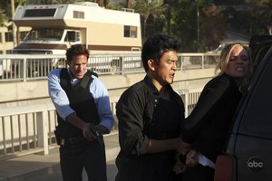 1. L’Agent Mark Benford. Il était en pleine poursuite sur la route de terroristes quand le flashforwxard a eu lieu. Sa vision : d’abord, ce qui le marque est qu’il s’est remis à boire. Ensuite, il est dans son bureau en train d’examiner le tableau dans lequel il analyse toutes les preuves rassemblées dans le cadre de son enquête sur ce phénomène. Des hommes armés aux bras tatoués entrent dans le bureau du FBI de Los Angeles et il se cache.