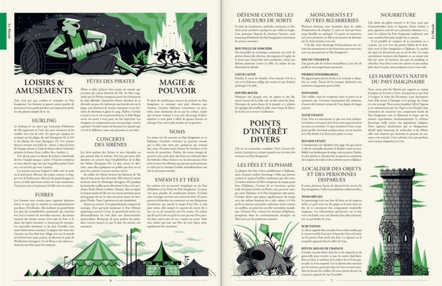 – Le Monde (10 pages), décrit le pays imaginaire, les voyages, la routine, lieux notables, les loisirs et amusements dans l’île, ainsi que la magie. Ce chapitre fournit aussi des règles avancées (rencontres aléatoires, exploration, récupération sur les cadavres, poursuite...)