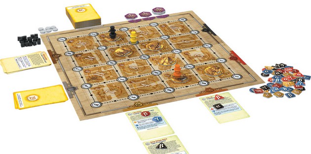 Contenu de la boîte : 1 plateau de jeu, 3 pions exclusifs, 60 cubes et 15 disques en bois, 30 jetons en carton, 64 marqueurs, 18 tuiles en carton, 1 livret de règles et 4 paquets de 72 cartes."