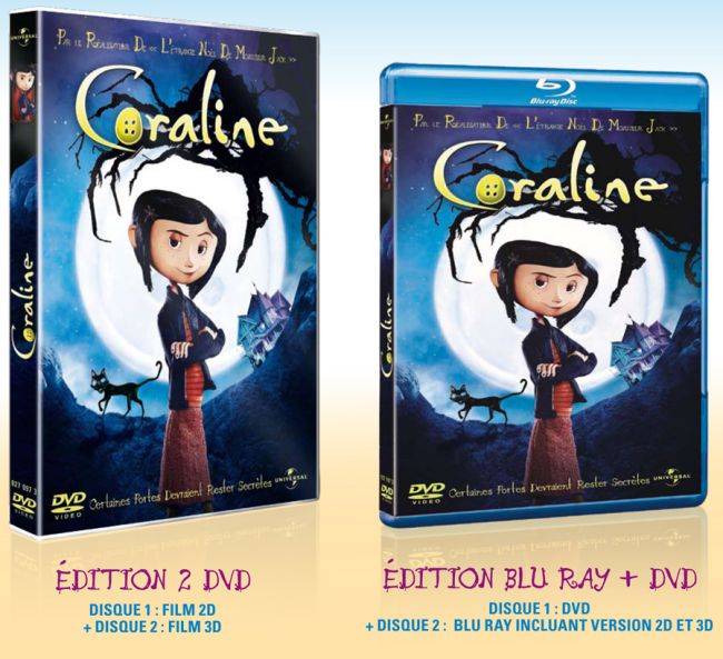 C’est le 27 octobre que sort en DVD et Blu-Ray le film Coraline. Particularité non négligeable pour cette sortie le film sera à la fois présenté en 2D mais aussi en 3D avec en cadeau 4 paires de lunettes 3D.