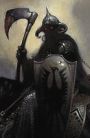 Death Dealer est, comme son nom l’indique, le semeur de mort. Monté sur son cheval noir aux yeux rouges (comme lui) et à la hache ensanglantée, il est l’œuvre de Frank Frazetta. Il est un célèbre peintre à qui l’on doit de nombreuses illustrations de Conan le Barbare, Buck Rogers, Tarzan, Vampirella...